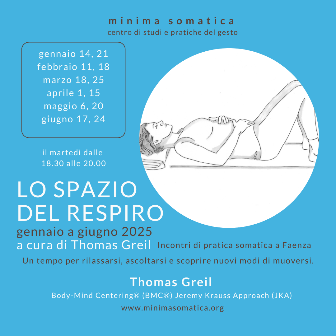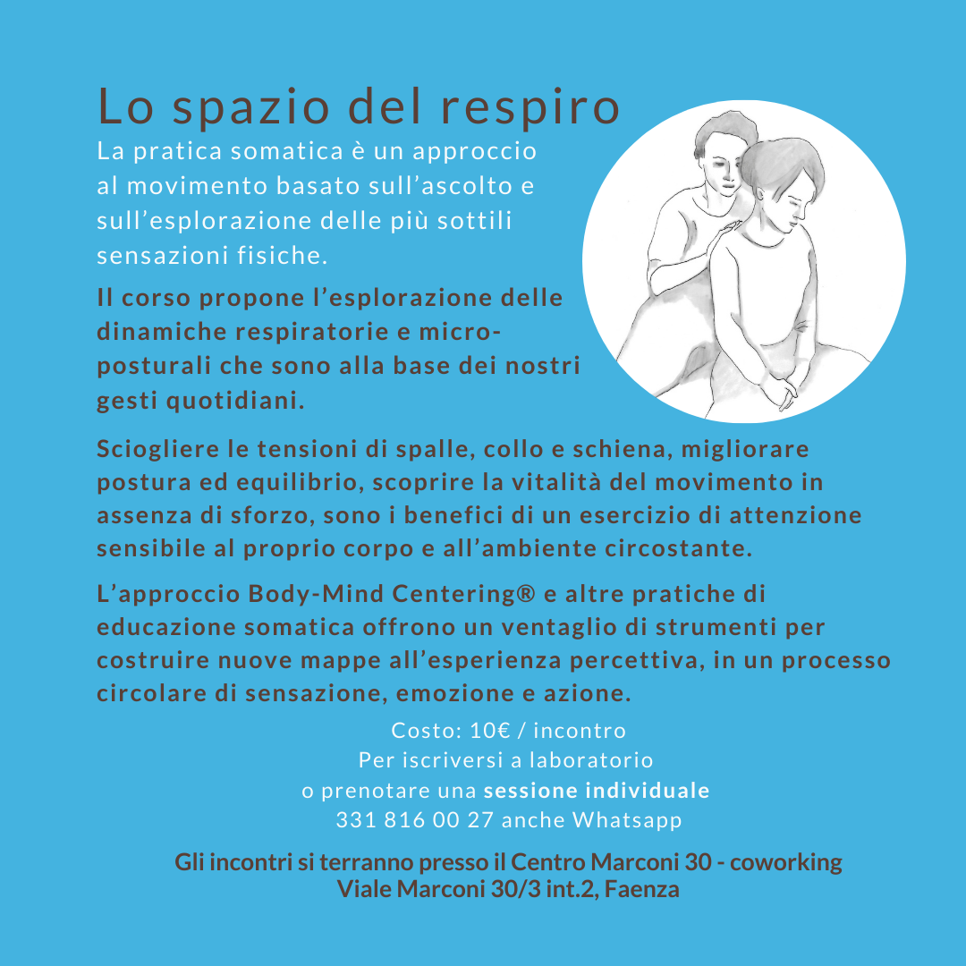 Un tempo per rilassarsi, ascoltarsi e scoprire nuovi modi di muoversi. La pratica somatica è un approccio al movimento basato sull’ascolto e sull’esplorazione delle più sottili sensazioni fisiche. Sciogliere le tensioni di spalle, collo e schiena, migliorare postura ed equilibrio, o ancora scoprire una nuova vitalità di movimento in assenza di sforzo, sono i benefici dell’esercizio di attenzione sensibile al proprio corpo e al rapporto con lo spazio.